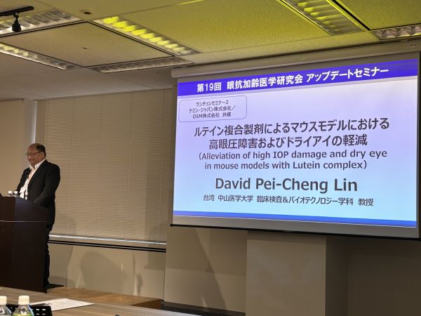 研究成果之部分內容,已於日本「第19回 眼抗加齡醫學研究會 アップデートセミナー」中進行學術分享。該場次為【ランチョンセミナー2】,由 KEMIN Japan 株式会社 與 DSM 株式会社 共同主辦,並由中山醫學大學研究主持人 林培正教授受邀發表,主題為: