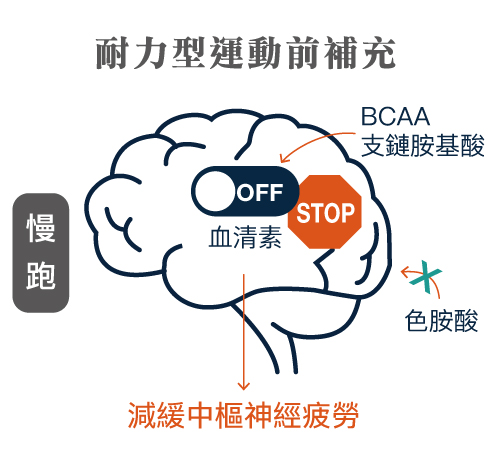 於耐力型運動前補充,BCAA與色胺酸競爭通過血腦障壁,阻礙色胺酸進入大腦生成血清素, 減少疲勞、肌肉酸痛與肌肉組織損傷。